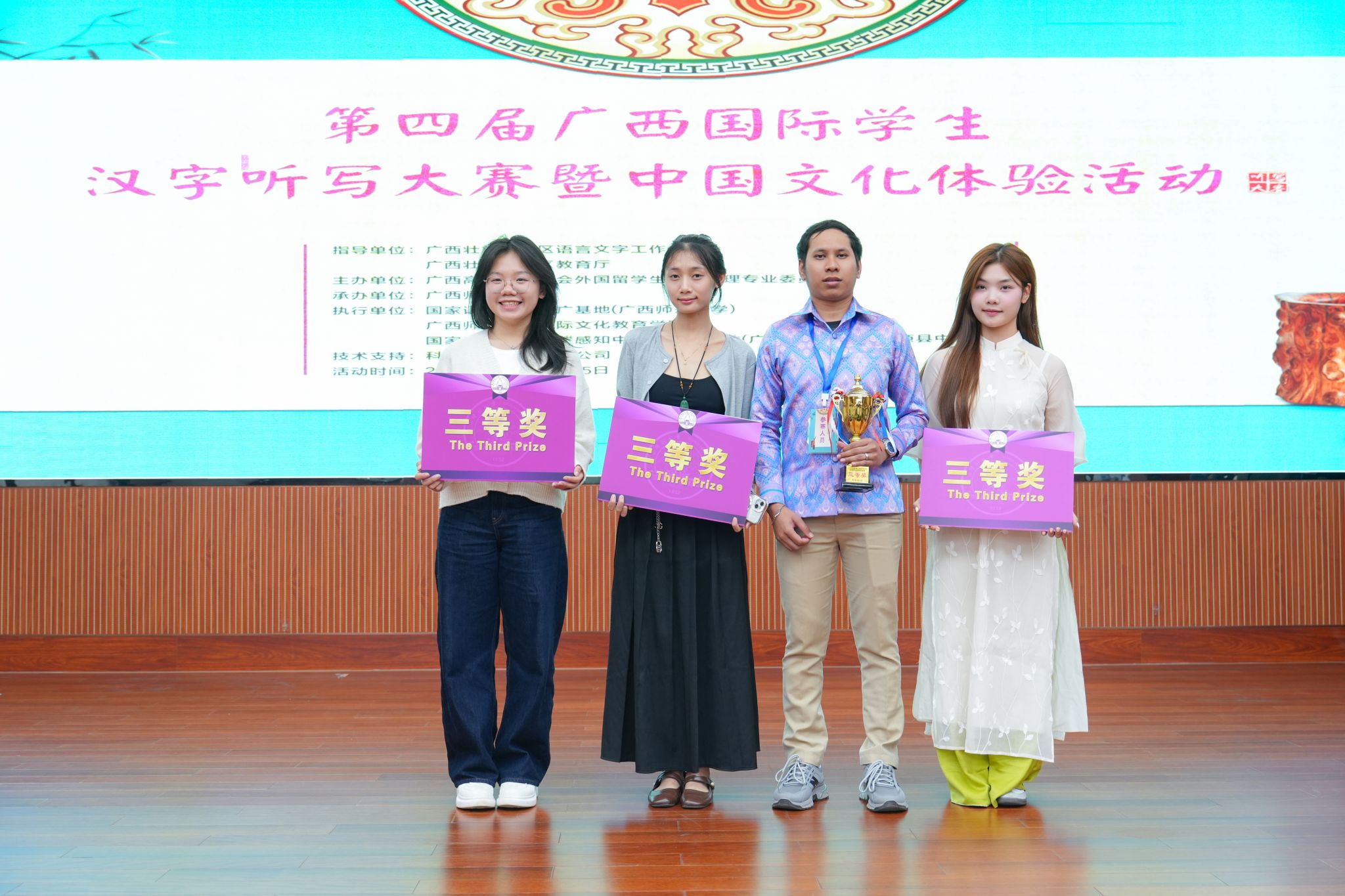 11月13日-14日,由广西高等教育学会外国留学生教育管理专业委员会主办的第四届广西国际学生汉字听写大赛在广西师范大学隆重举行,我校来自柬埔寨、越南及老挝的6名留学生参加了此次活动,并荣获三等奖两项、优秀奖两项。