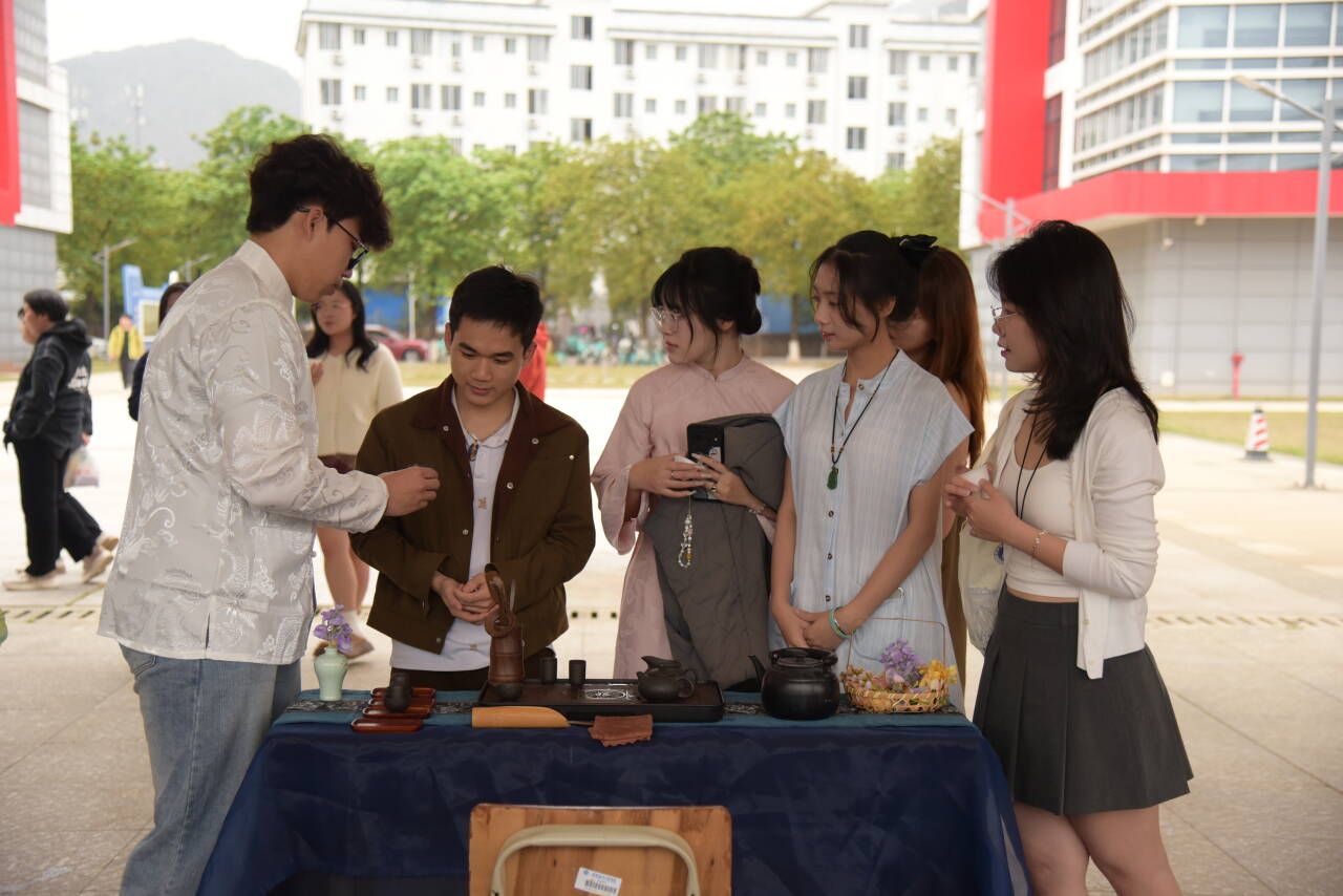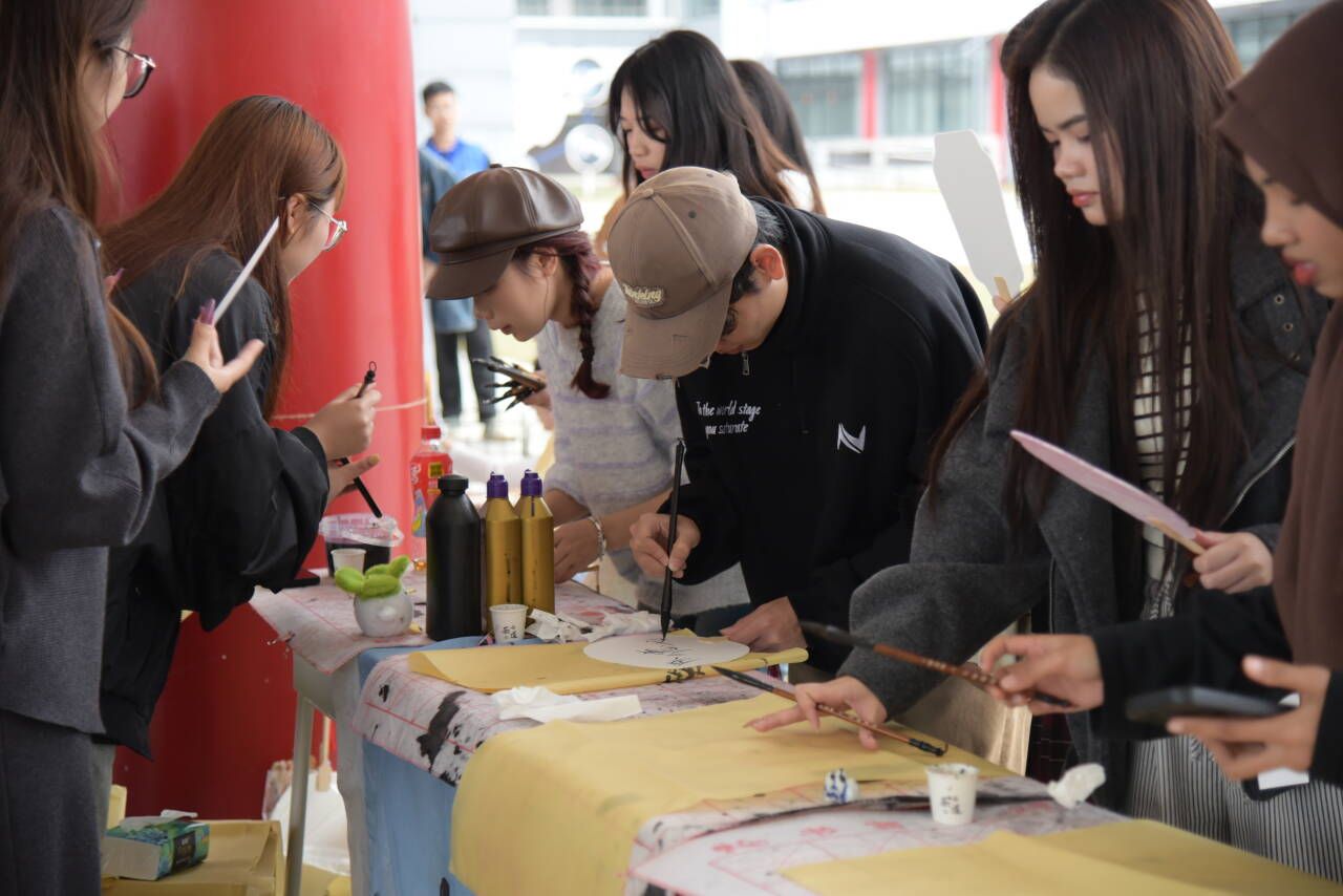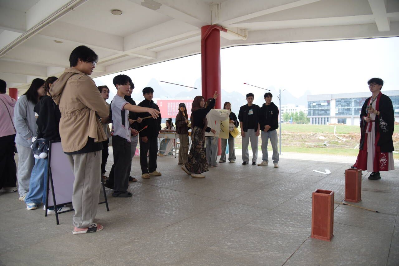 活动内容设置丰富多元,兼具趣味性与知识性,涵盖了漆扇制作、书法体验、茶艺展示、汉服讲解以及投壶游戏等多个环节。在漆扇体验区,留学生们在萤火虫书画协会成员的指导下自主调配色彩,亲手制作专属漆扇,感受传统工艺的匠心;书法体验区里,大家手握毛笔,认真临摹汉字,在笔墨书香中体会汉字的形体之美;茶艺展示环节,茶文化协会的同学详细讲解了茶礼、茶俗,留学生们则亲手泡茶、品茶,感受中国茶文化的雅致与深邃;在惊鸿汉服社同学的帮助下,留学生们不仅了解了汉服的形制与文化内涵,还亲身体验了投壶游戏的乐趣,欢声笑语不断,氛围热烈而融洽。